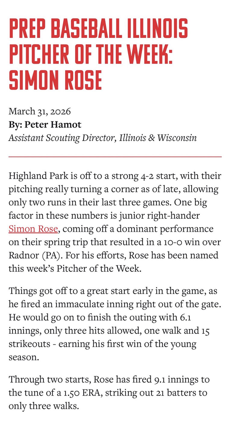 "It has been an absolute joy to coach Simon. His passion and work ethic make it clear he has what it takes to compete at the next level. Instinctually mature beyond his years, he commands shortstop as the captain of our infield—always in the right spot to make a play, no matter the situation. On the mound, he’s been a force for us, starting against some of our toughest opponents without ever blinking. He competes in the zone with multiple pitches and consistently gives us a chance to win every time he takes the ball. At the plate, he’s just beginning to scratch the surface of his potential, and I’m excited to watch his gap-to-gap power continue to develop."